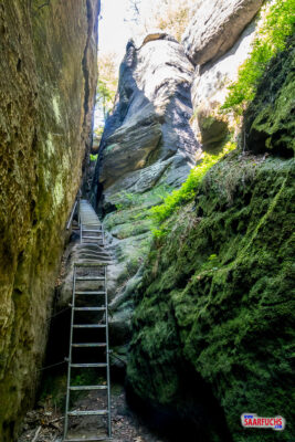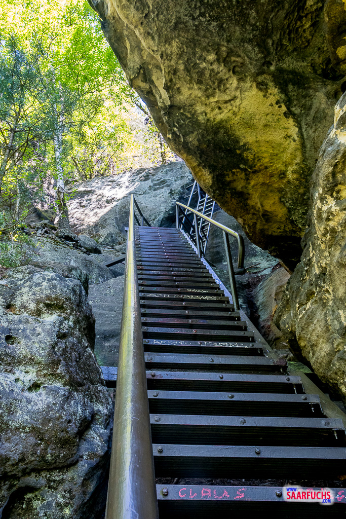 Da wir zur Schrammsteinaussicht wollen, nehmen wir den Wildschützensteig, der nur aufwärts begangen werden soll. Unterwegs beantworten wir noch eine Lab-Frage und steigen dann über viele Leitern durch eine enge Schlucht nach oben.