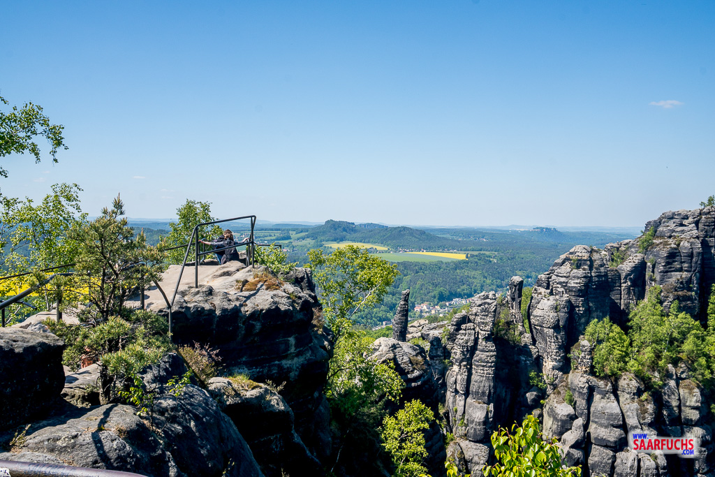 Der Weg über die Felsen bis zum vorderen Aussichtspunkt ist durch Eisengeländer gut abgesichert. Von dort bietet sich mir ein beeindruckender Panoramablick über die bizarren Felsnadeln der Schrammsteinkette und die und die umliegenden Tafelberge der Sächsische Schweiz.
