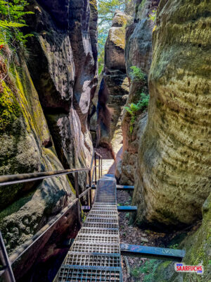 Hier suchen und loggen wir den Tradi Breite-Kluft-Aussicht und folgen danach dem Wanderweg nach unten. Auch hier wurde eine Stiege gebaut, die sich in engen Serpentinen durch diese Kluft nach unten schlängelt.