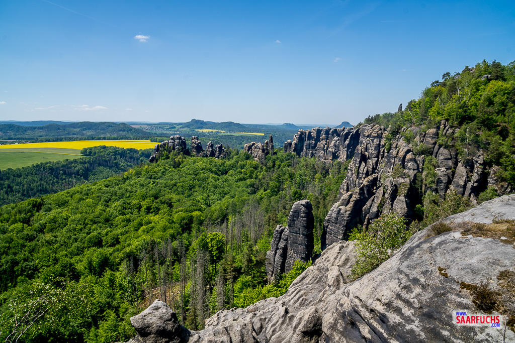 Nach links zur Schrammsteinaussicht ist der Gratweg gesperrt. Wir biegen nach rechts und folgen dem Gratweg, der hier mit Leitern und Stufen über den Grat führt. Dabei bietet sich uns die ein oder andere beeindruckende Aussicht.