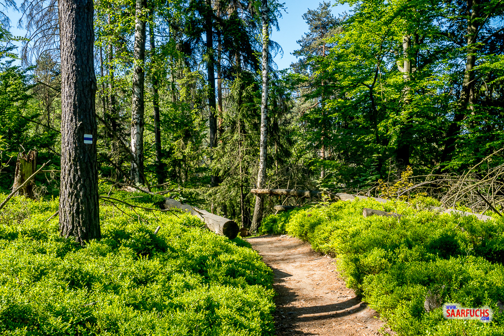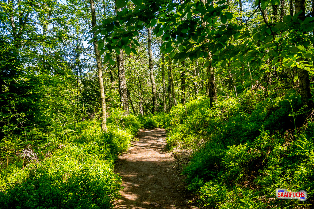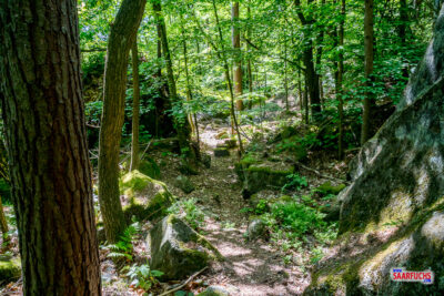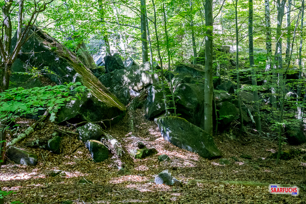 Nach etwa 1,5 Kilometer auf diesem breiten Fahrweg piepst mein GPS. In der Planung dieser Wanderung habe ich mir eine Alternative gesucht, die – wie ich jetzt weiß – durch die ehemaligen Steinbrüche verläuft. Wir verlassen also den Fahrweg nach links und folgen einem steil abfallenden kleinen Pfad, der, je tiefer wir kommen, immer schlechter zu sehen ist. Am Ende des Abstiegs erreichen wir eine ebene Fläche mit ziemlich vielen Felsbrocken.