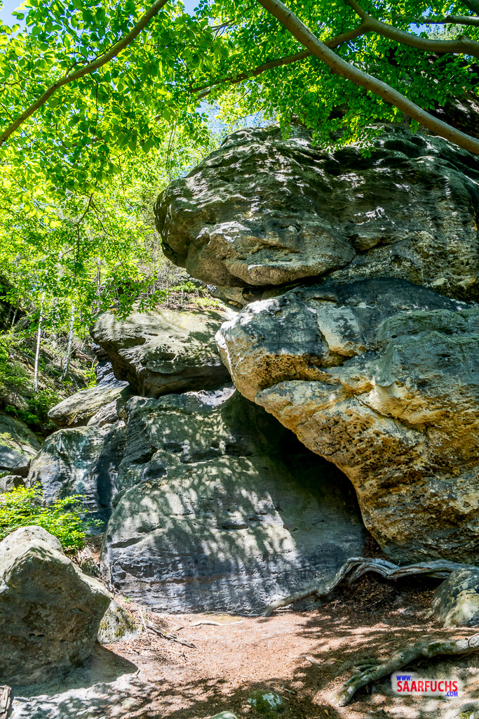 Kurze Zeit später erreichen wir die engste Stelle dieser kleinen wildromantischen Felsenschlucht, die den Namen „Lattengrund“ trägt. Dort suchen und loggen wir den gleichnamigen Tradi Lattengrund.