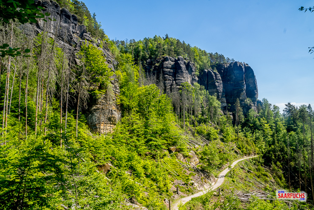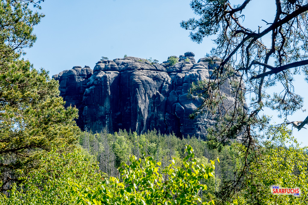 An der nächsten großen Kreuzung biegen wir nach links und sehen zum ersten Mal die mächtigen Felsen der Schrammsteine. Wir folgen dem mit Barrieren eingefassten Wanderweg.