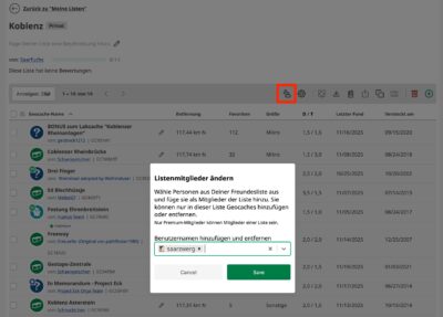 Klickt ihr darauf, öffnet sich ein Dialogfenster. In diesem Fenster könnt ihr die Geocaching-Namen der Geocacher aus eurer Freundesliste einfügen, die mit euch zusammen diese Liste bearbeiten können sollen.