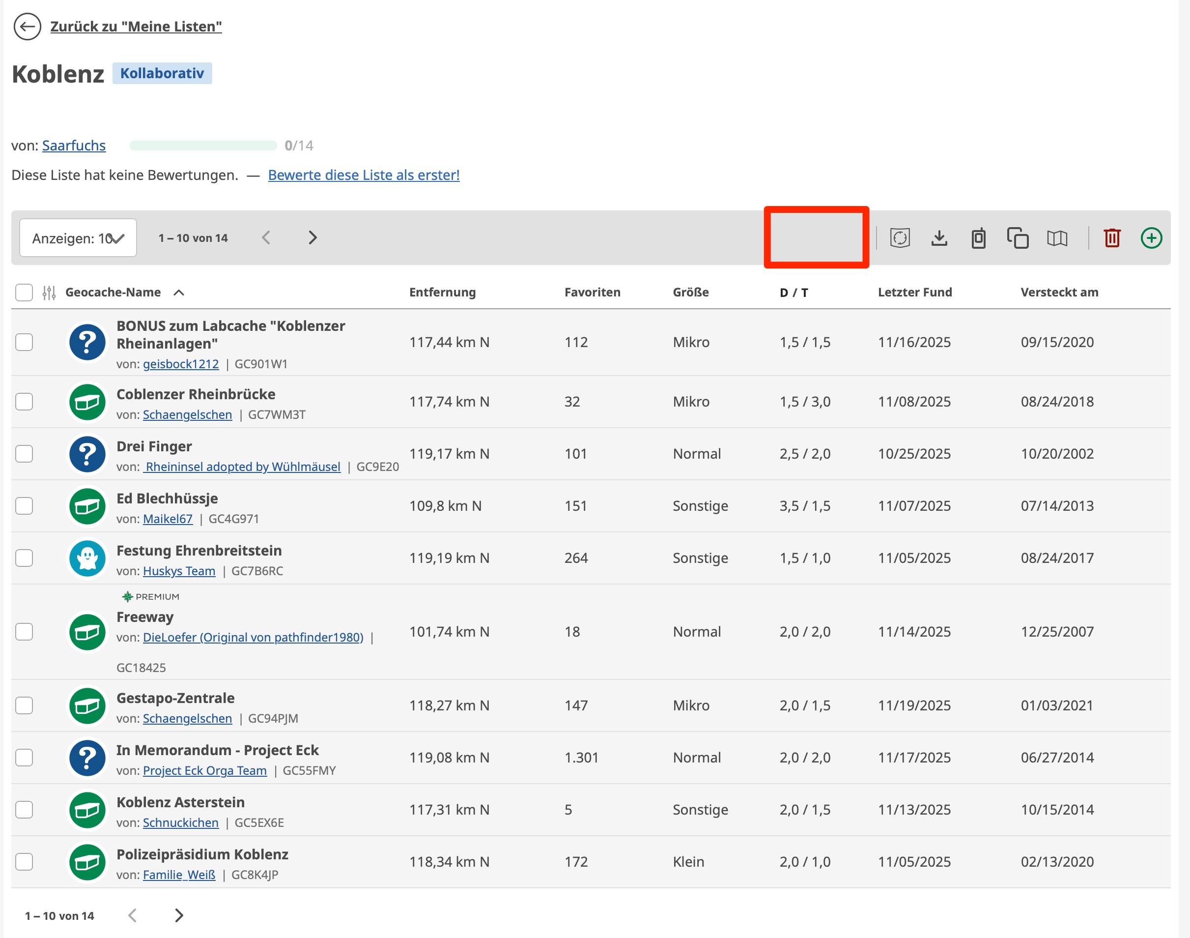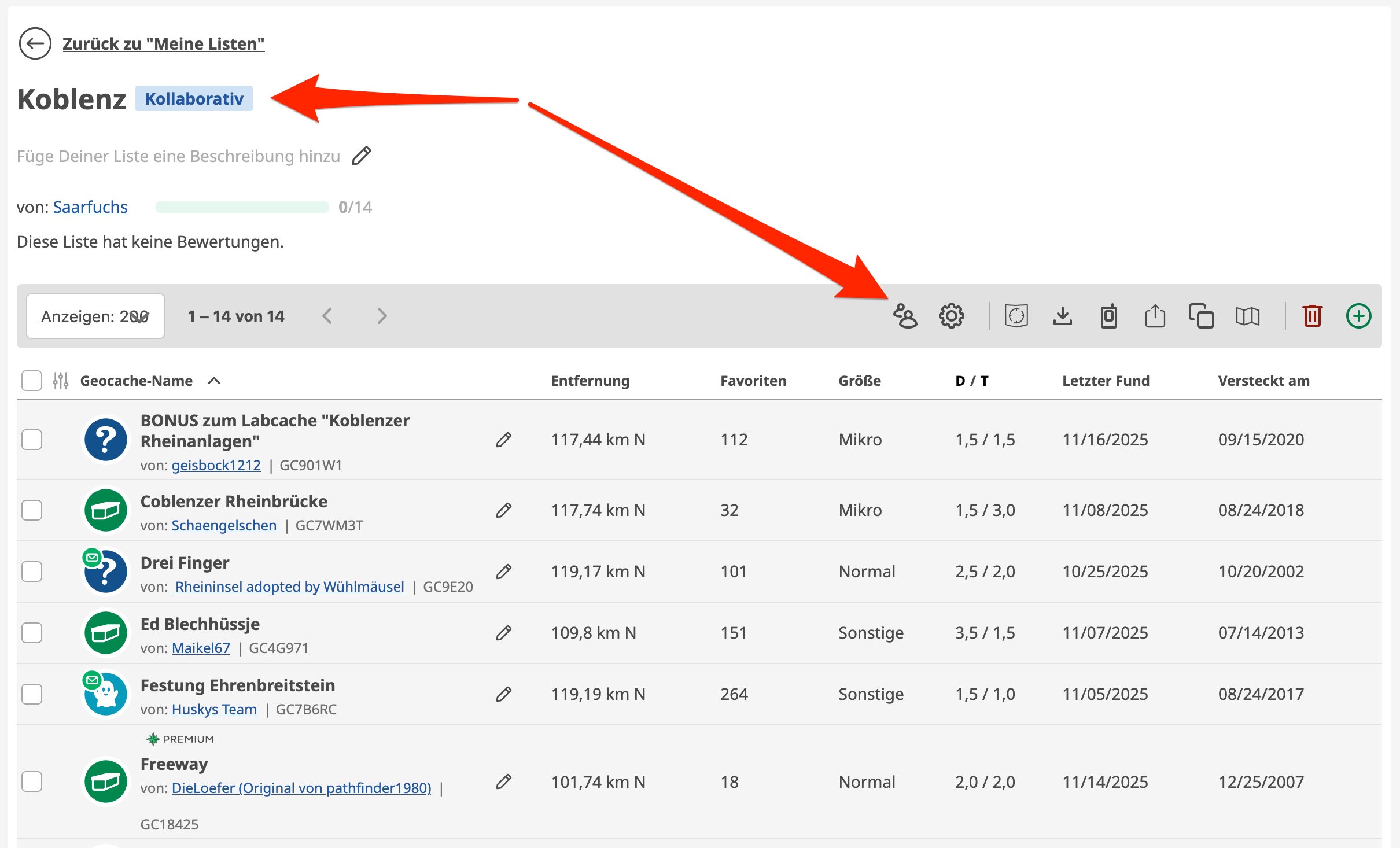 Die Bearbeiter können also nur Geocaches zur Liste hinzufügen oder daraus entfernen.