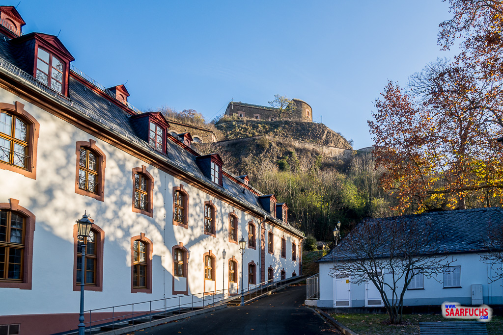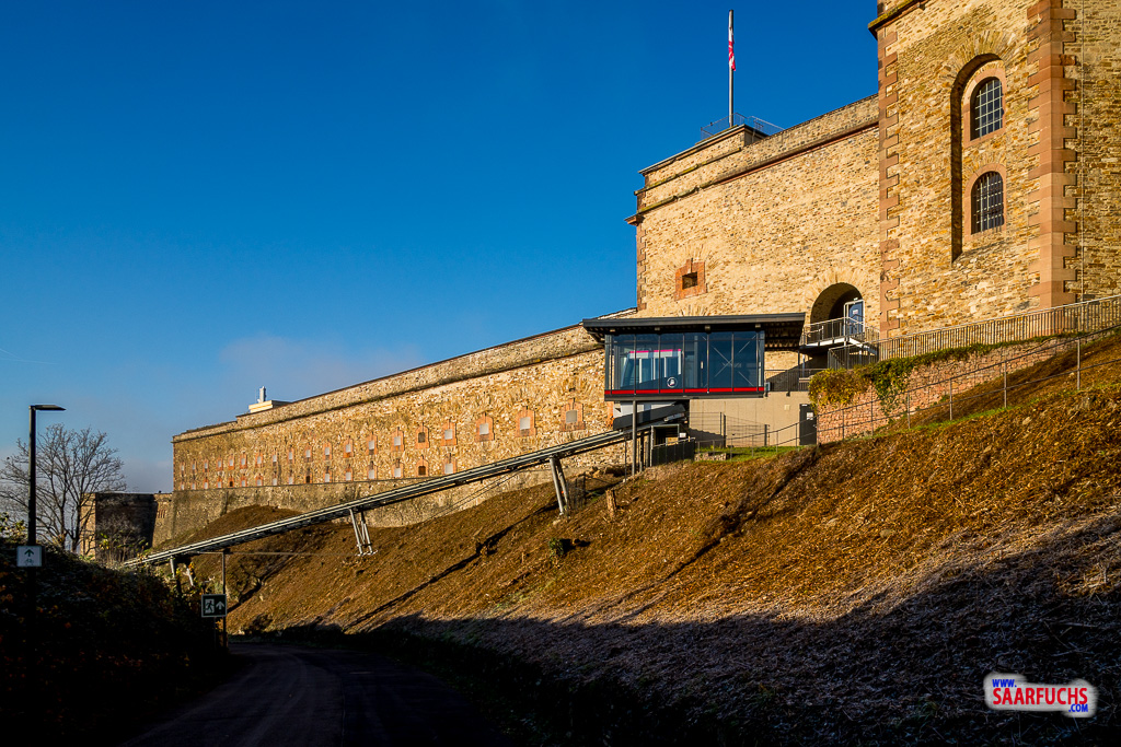 Da die Jugendherberge in der Festung Ehrenbreitstein oft ausgebucht ist, habe ich mir schon über ein Jahr im Voraus ein Zimmer dort für Ende November gebucht. Einen Tag vor der Anreise hat mich die Jugendherberge informiert, dass der Schrägaufzug außer Betrieb sei und ich oben auf dem großen kostenpflichtigen Parkplatz mein Auto abstellen soll.