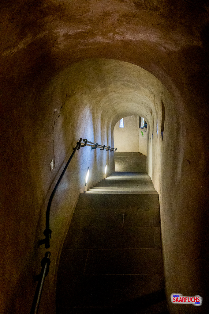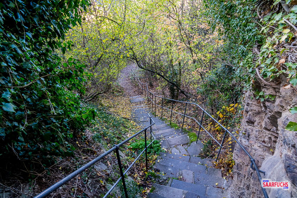 Anschließend macht der Felsenweg einen großen Bogen um das Fort Helfenstein. Nachdem ich noch zwei weitere Tore durchschritten habe, biegt auf der linken Seite ein ausgeschilderter Weg hinunter nach Ehrenbreitstein ab. Ich gehe durch die offene Tür und steige die vielen Treppen hinunter.