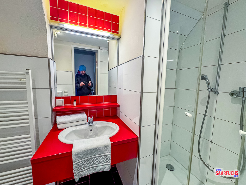 Das Bad in meinem Zimmer ist modern und verfügt über Toilette, Waschbecken und eine großen Dusche.