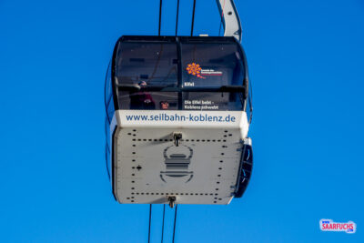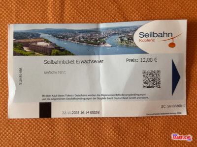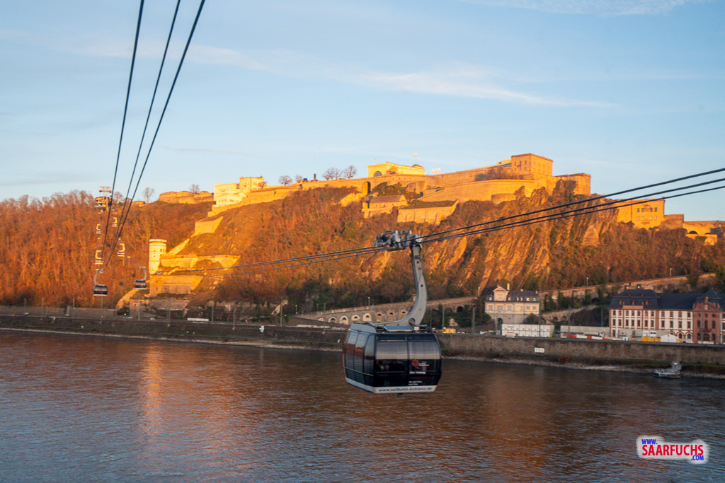 Die Warteschlange ist recht kurz. Als die nächste Kabine kommt, kann ich einen Platz vorne am Fenster ergattern. In knapp zehn Minuten bringt mich die Seilbahn nach oben auf das Plateau unmittelbar vor der Festung Ehrenbreitstein.
