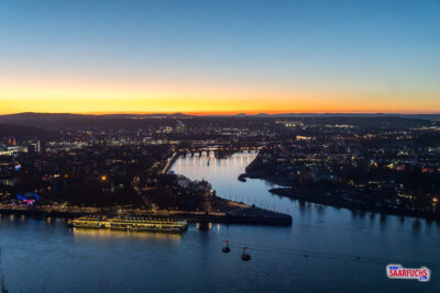 Nach dem Abendessen drehe ich eine Runde durch die toll beleuchtete Festung Ehrenbreitstein. Als Erstes gehe ich zum Aussichtspunkt auf der großen Sonnenterrasse unmittelbar vor dem Eingang der Jugendherberge. Dort bekomme ich diesen tollen Blick auf das Deutsche Eck, wo die Mosel in den Rhein fließt.