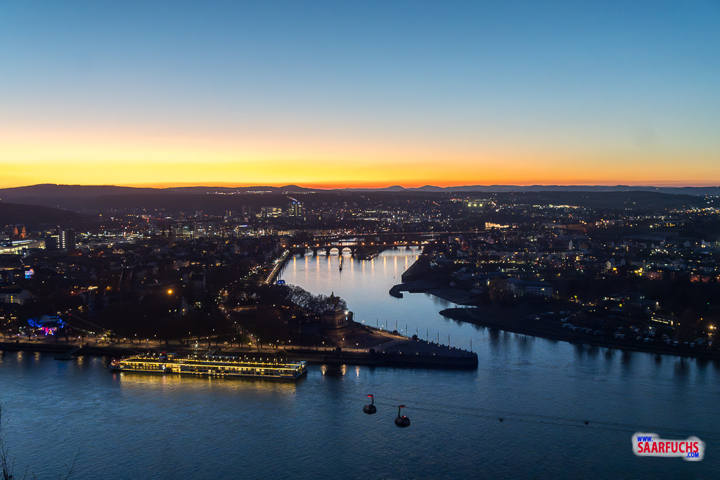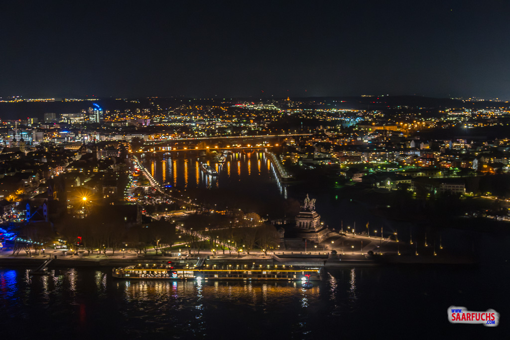 Koblenz ist am Abend schön beleuchtet. Obwohl es inzwischen bitterkalt geworden ist, verbringe ich einige Zeit am Aussichtspunkt mit Schauen und Fotografieren.