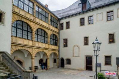 Die Georgenburg, eines der ältesten und imposantesten Gebäude, thront innerhalb der Festung Königstein. Ihr heutiges Erscheinungsbild wurde maßgeblich durch die umfassenden Umbauten im 16. Jahrhundert geprägt. Zunächst gehen wir durch den rechten Eingang und schauen uns die Ausstellung an.