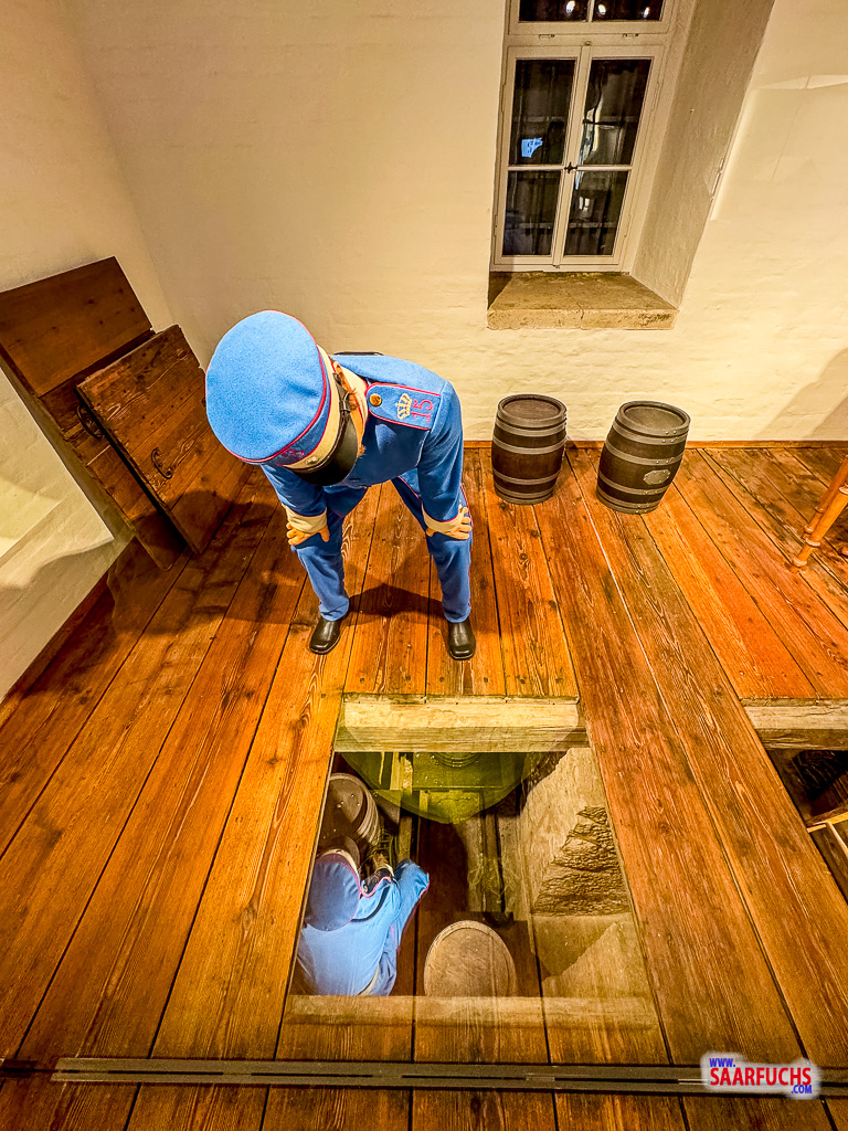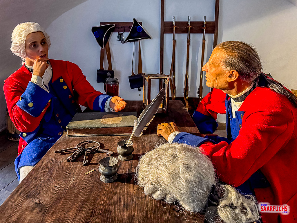 Anschließend schauen wir uns im ehemaligen Gefängnis etwas um. Mit lebensgroßen Figuren wird die Wachstube anschaulich dargestellt.