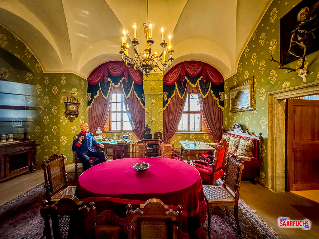 Noch etwas weiter befinden wir uns in der Kommandantenwohnung: Die ursprünglich Ende des 16. Jahrhunderts im Südflügel des Torhauses eingerichtete Wohnung des Festungskommandanten auf dem Königstein ist heute als Ausstellungsensemble im Stil der Jahre 1898 bis 1904 nachempfunden. Der Festungskommandant war als ranghöchster Befehlshaber für die gesamte Organisation der Festung zuständig – von der Gerichtsbarkeit über die Versorgung bis hin zum Empfang hoher Gäste.