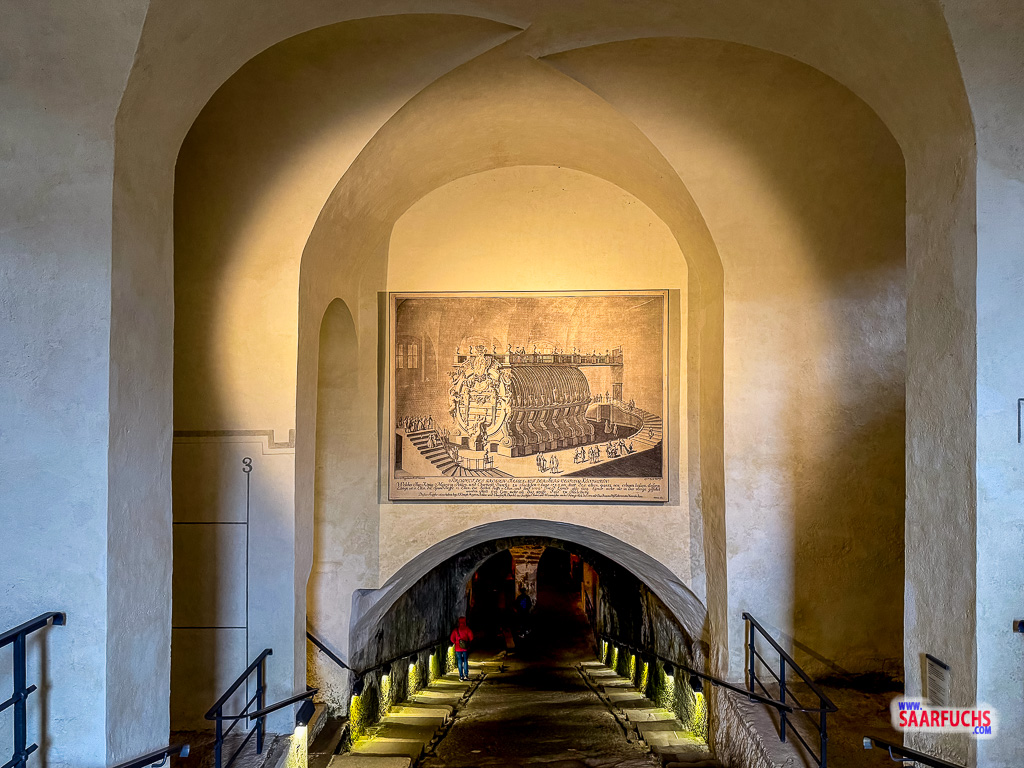 Nachdem uns die Ausstellung in der Georgenburg so gut gefallen hat und wir noch etwas Zeit haben, wollen wir uns auch die anderen Gebäude anschauen. Wir beginnen mit dem Fasskeller der Magdalenenburg, dessen Eingang sich an der Frontseite des großen roten Gebäudes befindet. Die Magdalenenburg war einmal das Proviantmagazin der Festung.