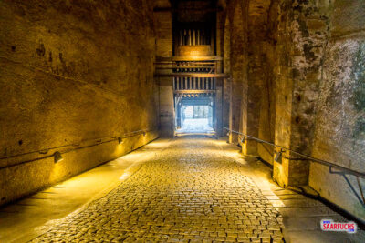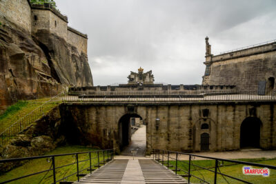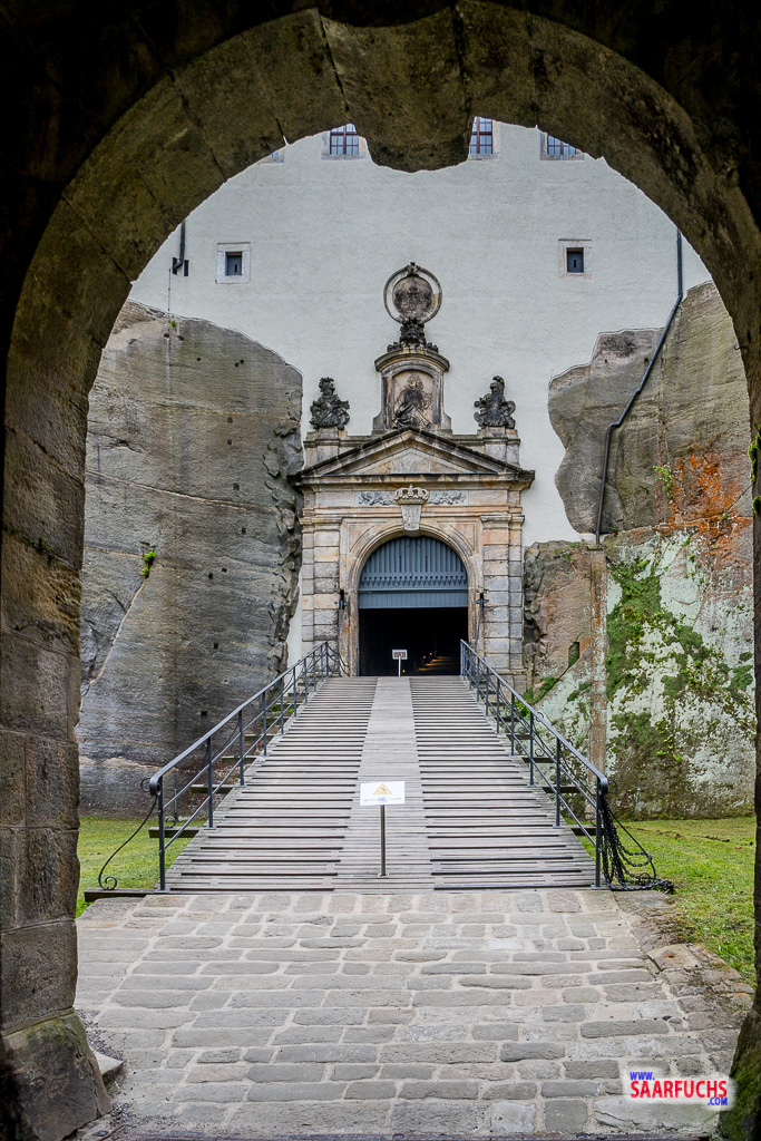 Anschließend verlassen wir die Festung Königstein durch den Haupteingang. Dazu laufen wir die helle Appareille, eine Rampe, hinunter zum ersten Tor.
