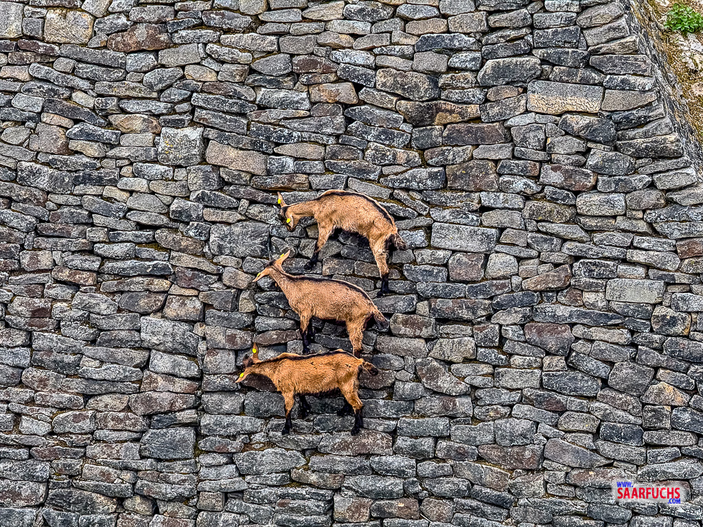 Jetzt wollen wir eine große Runde über die Festungsmauer drehen. Dabei kommen wir bei den Ziegen vorbei, die gleich neben dem Zeughaus ihre Kletterkünste in einer Mauer beweisen. Dieses Bild ist keine Fotomontage! Ich hatte das Glück in dem Moment meine Kamera auszulösen, als sich die drei wie die Bremer Stadtmusikanten an der Mauer übereinander stellten.