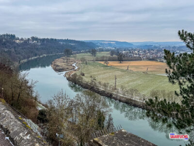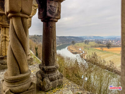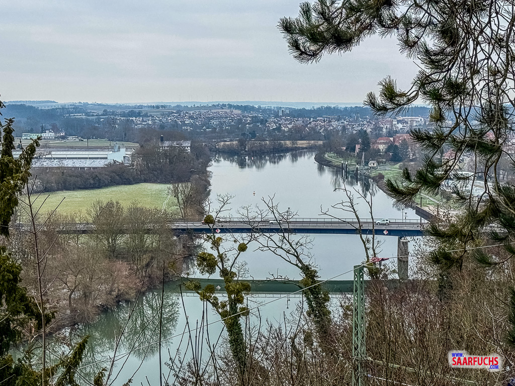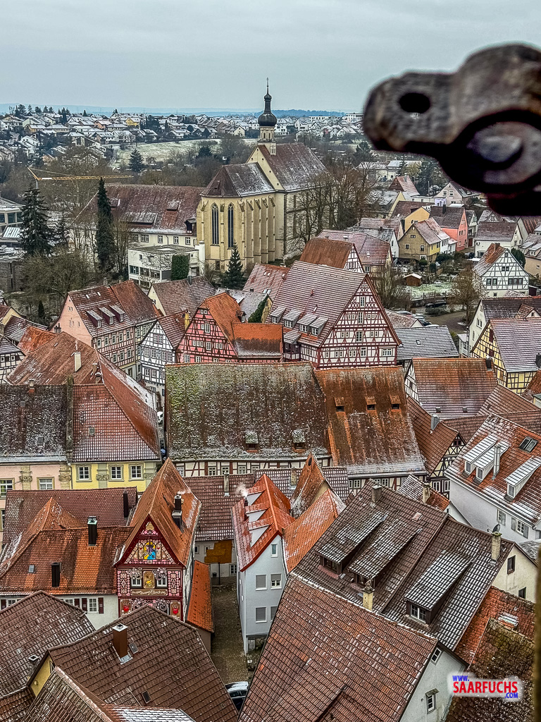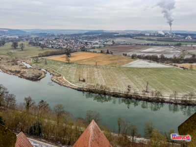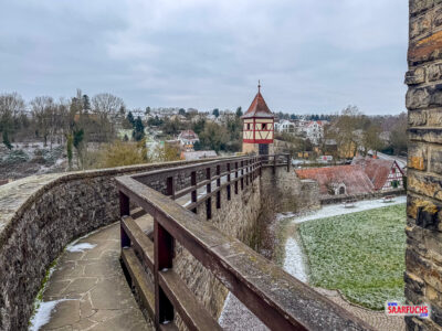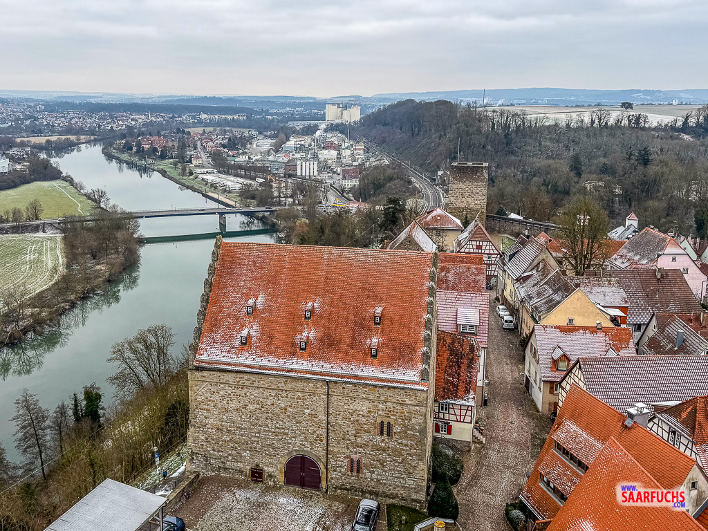 Ich steige die Treppen zum Roten Turm hinauf, um dort feststellen zu müssen, dass dieser über Winter nicht bestiegen werden kann. Von der Stadtmauer bekomme ich aber einen weiteren schönen Blick auf den hier renaturierten Neckar.