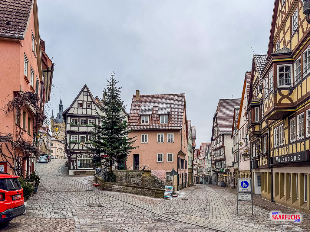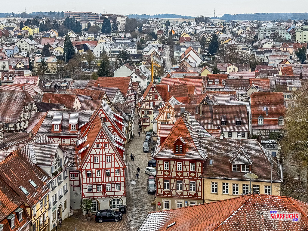 Anschließend laufe ich in die historische Altstadt mit ihren vielen Fachwerkhäusern. Ich werfe noch einen letzten Blick zurück zum Roten Turm.
