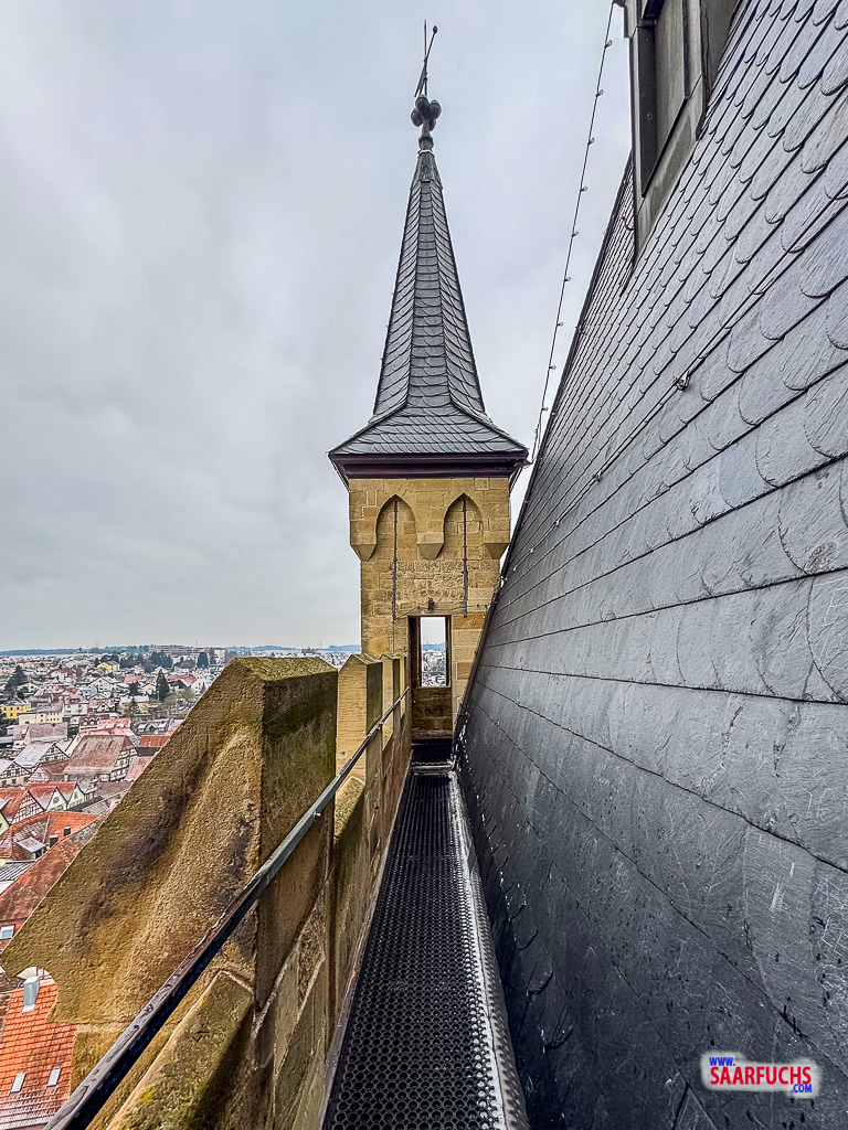 Um die schöne Aussicht vom Turm genießen zu können, muss ich zunächst 134 Stufen bis zur Türmerwohnung bewältigen. Dort entrichte ich die Eintrittsgebühr. Anschließend steige ich weitere 33 Stufen zur 32 Meter hoch gelegenen Aussichtsplattform hinauf. Wobei Plattform ist etwas übertrieben: Es handelt sich eher um einen kleinen Rundgang, der hinter den Zinnen verläuft.
