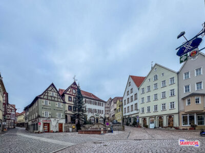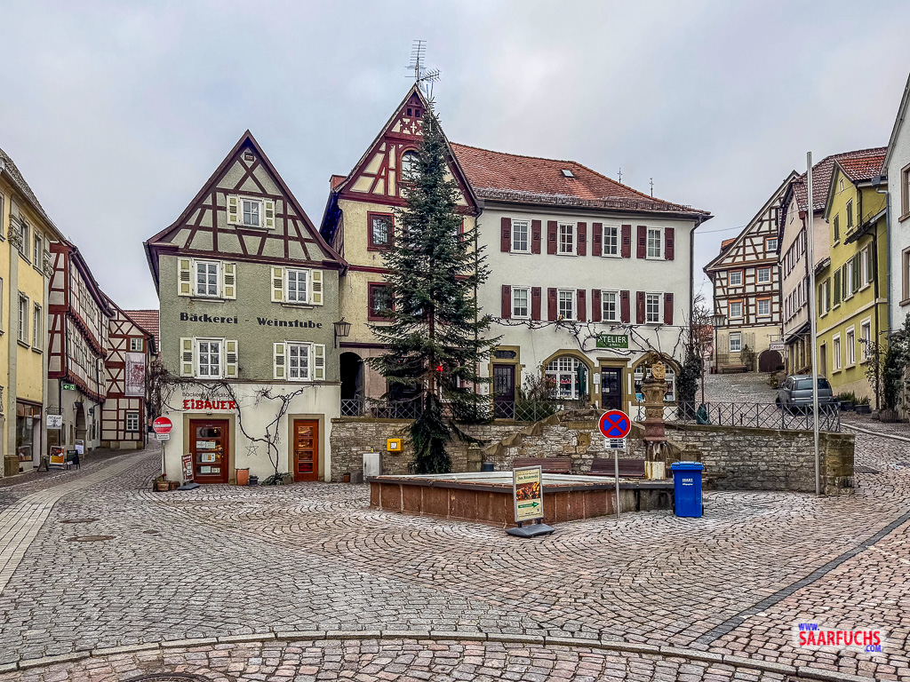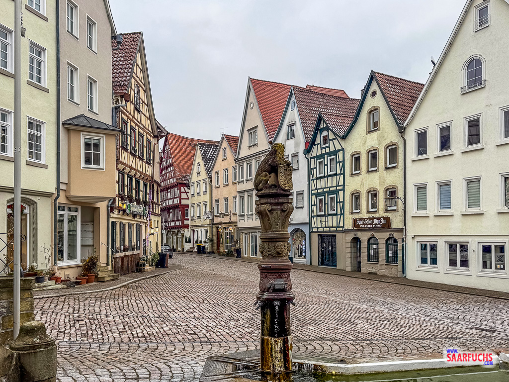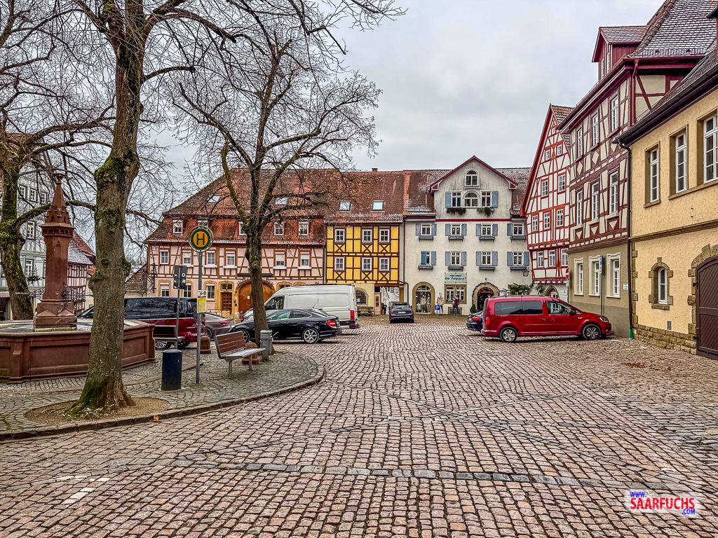 Der Marktplatz ist gesäumt von Fachwerkhäusern. In seiner Mitte steht der Marktbrunnen. Leider wird dieser Platz auch als Parkplatz für die Anwohner verwendet, was mich beim Fotografieren stört.
