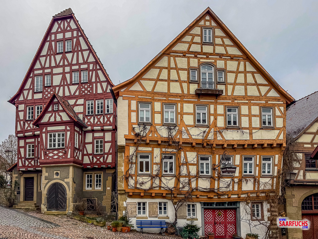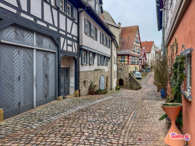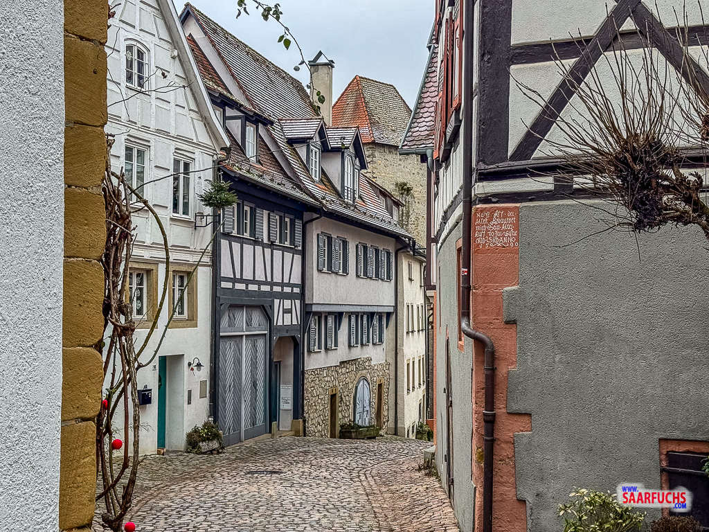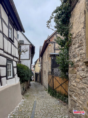 Auch hier entdecke ich ein paar interessante Fachwerkhäuser, die an einer gepflasterten Gasse stehen.