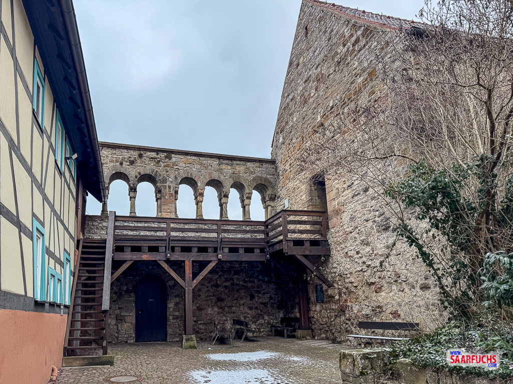 Gleich daneben sind noch die Arkaden vom ehemaligen Palas, dem Hauptgebäude der Kaiserpfalz, zu sehen. Die Holztreppe, die dort hinaufführt, ist mit Vorsicht zu genießen, da die Stufen kurz und die Treppe steil ist.