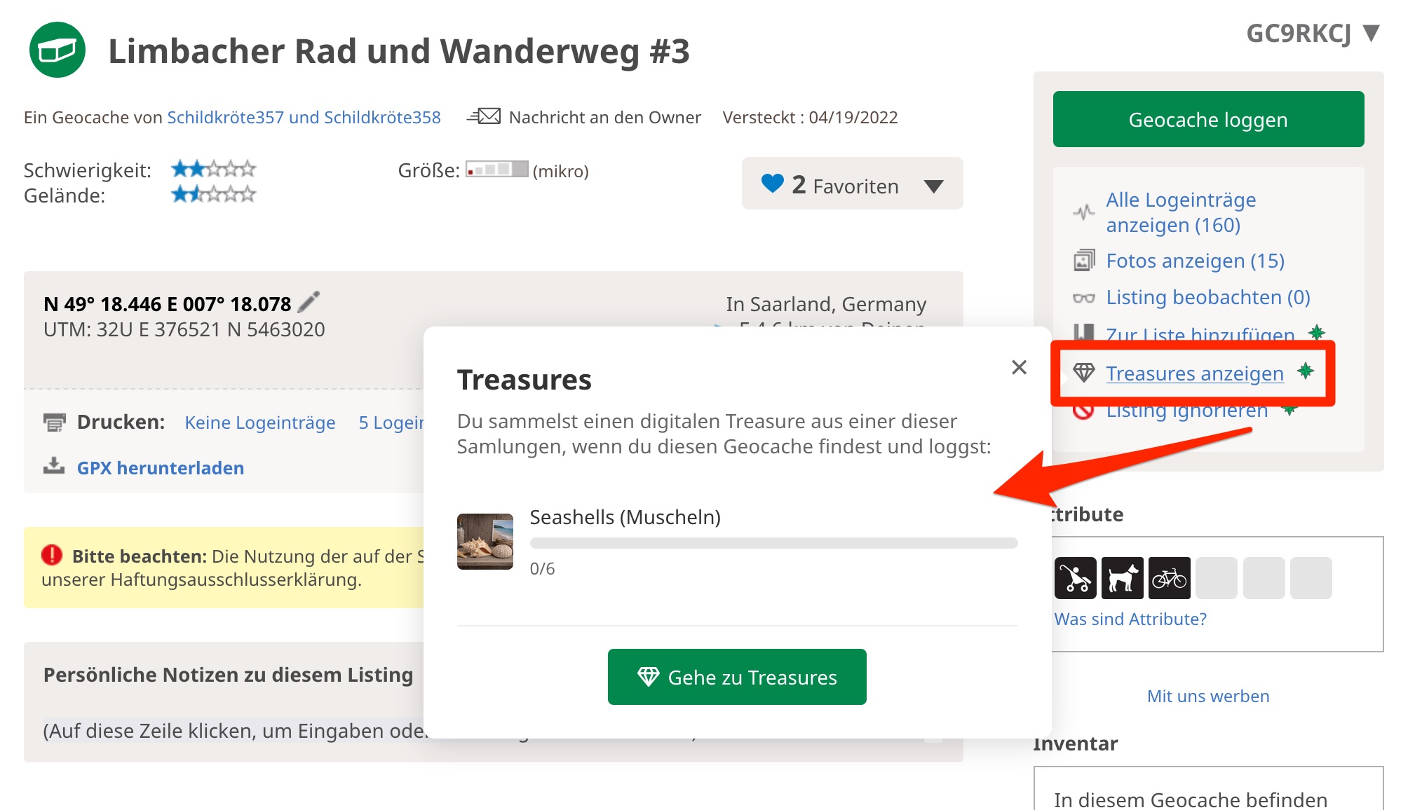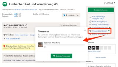 Um zu sehen, für welche Treasures der angezeigte Geocache genutzt werden kann, muss im oberen Menü der rechten Seitenleiste auf „Treasures anzeigen“ geklickt werden. Anschließend öffnet sich ein Dialog, der alle Treasures anzeigt, für die dieser Geocache infrage kommt.