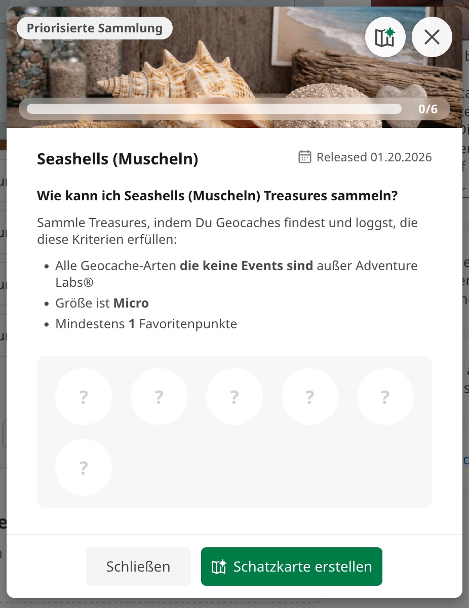 Zeitgleich mit dem Geocaching-Newsletter am 20. Januar 2026 wurde vom HQ die neue Schatzsammlung „Muscheln” (Seashells) veröffentlicht, die durch das Loggen von Micro-Caches mit mindestens einem Favoritenpunkt vervollständigt werden kann: