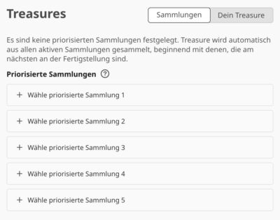 Seit Mitte Dezember haben Premium-Mitglieder Zugriff auf alle verfügbaren Treasure-Sammlungen gleichzeitig. Das bisherige Limit von drei aktiven Sammlungen entfällt somit. Zu den neuen Funktionen gehört die Möglichkeit, bis zu fünf bevorzugte Sammlungen zu priorisieren.