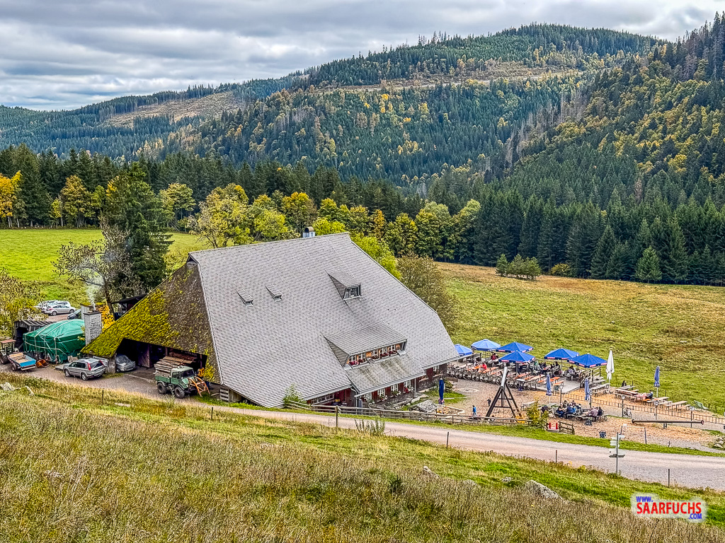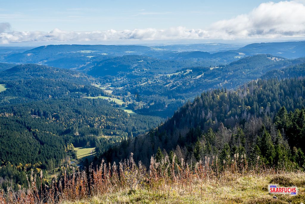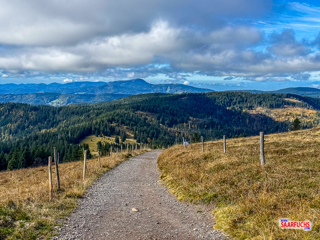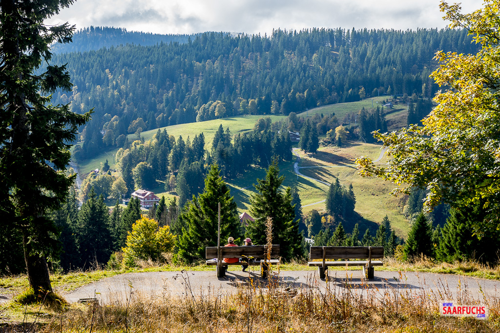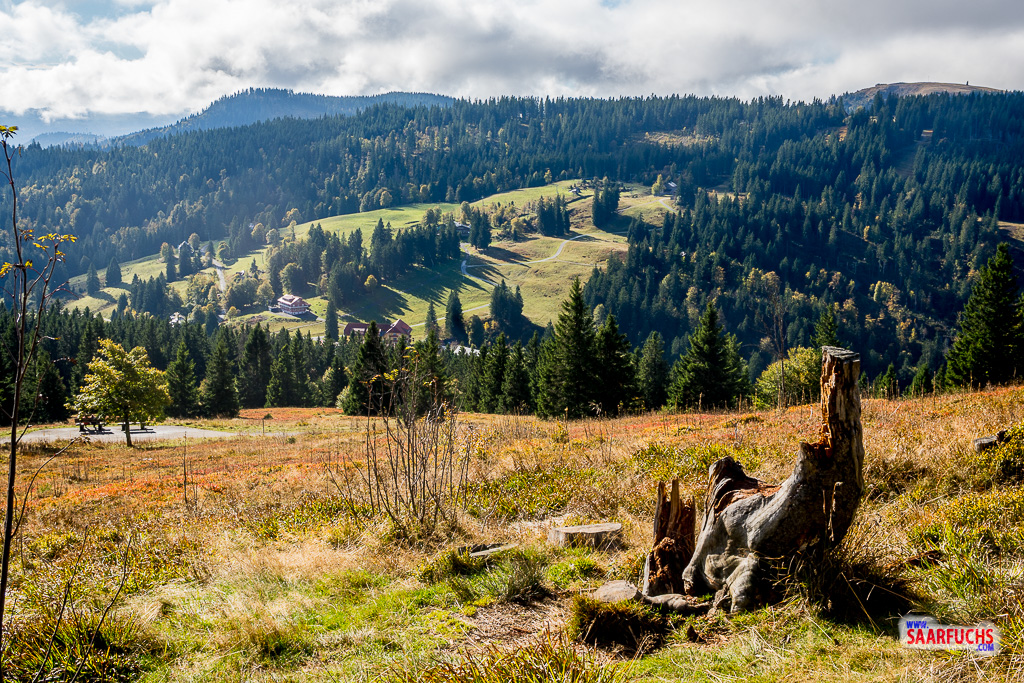 Der Vorteil dieser Wegführung ist, dass es unterwegs einige Aussichtspunkte gibt. Von hier aus kann ich unten im Tal bereits die Zastler-Hütte erkennen, in der ich meine Mittagspause verbringen möchte.