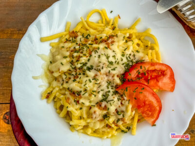 Danach gehe ich zum Schalter und bestelle ein großes Radler und eine Portion Käsespätzle. Das Bier kann ich gleich mitnehmen. Sobald das Essen fertig ist, werde ich gerufen.