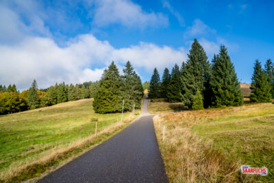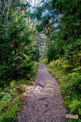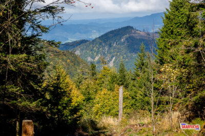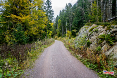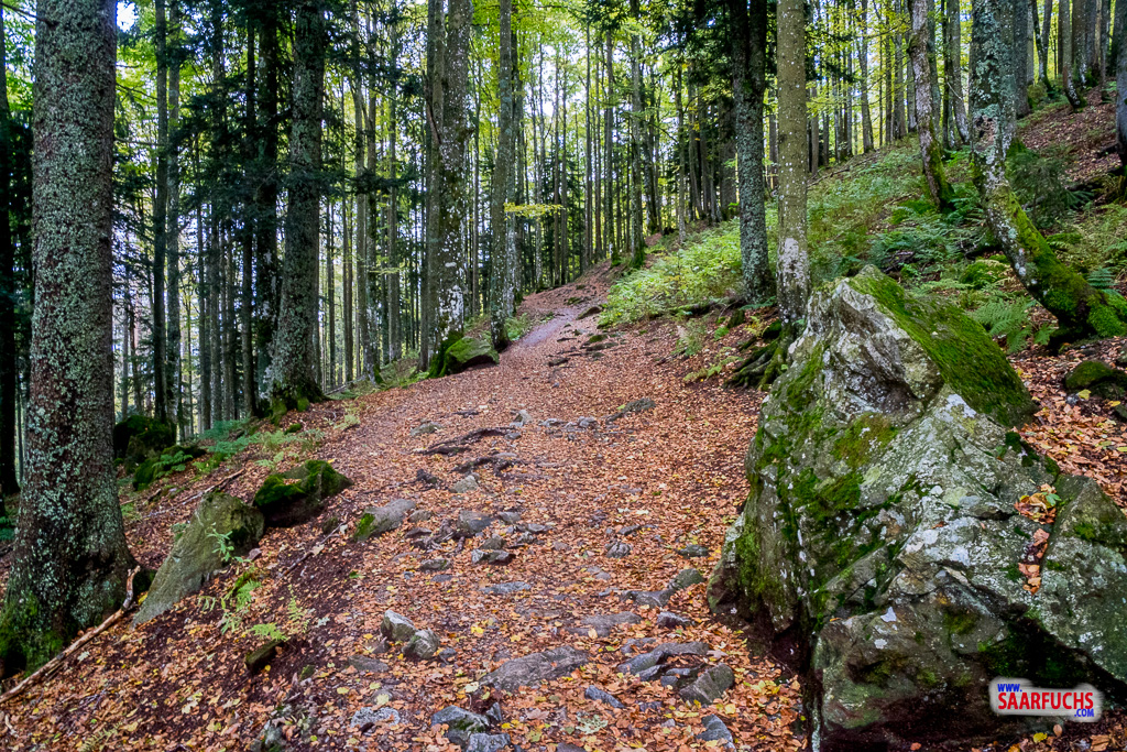 Es folgt noch ein kleiner Abstieg, der meine volle Konzentration fordert. Ich erreiche einen breiten Forstweg und wandere nun darauf weiter.