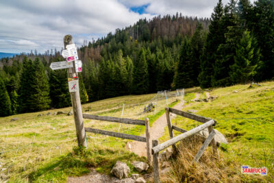 Ich folge dem Fahrweg, bis ich zu einem Wanderwegweiser komme. Hier biege ich in Richtung Wald ab.
