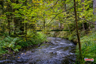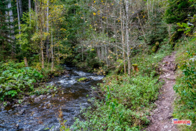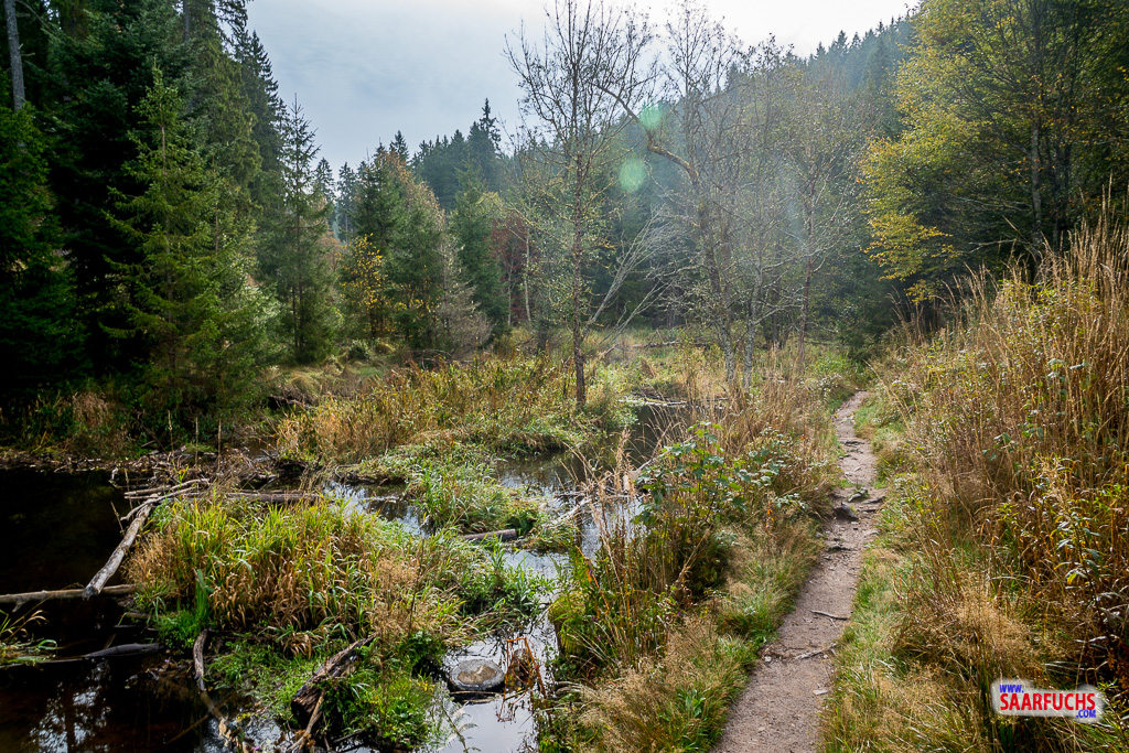 Ich habe sogar einige frisch gefällte Bäume entdeckt, die zeigen, wie aktiv die Tiere hier im Naturschutzgebiet am Werk sind. Der Wanderpfad läuft manchmal nahe am Bach …