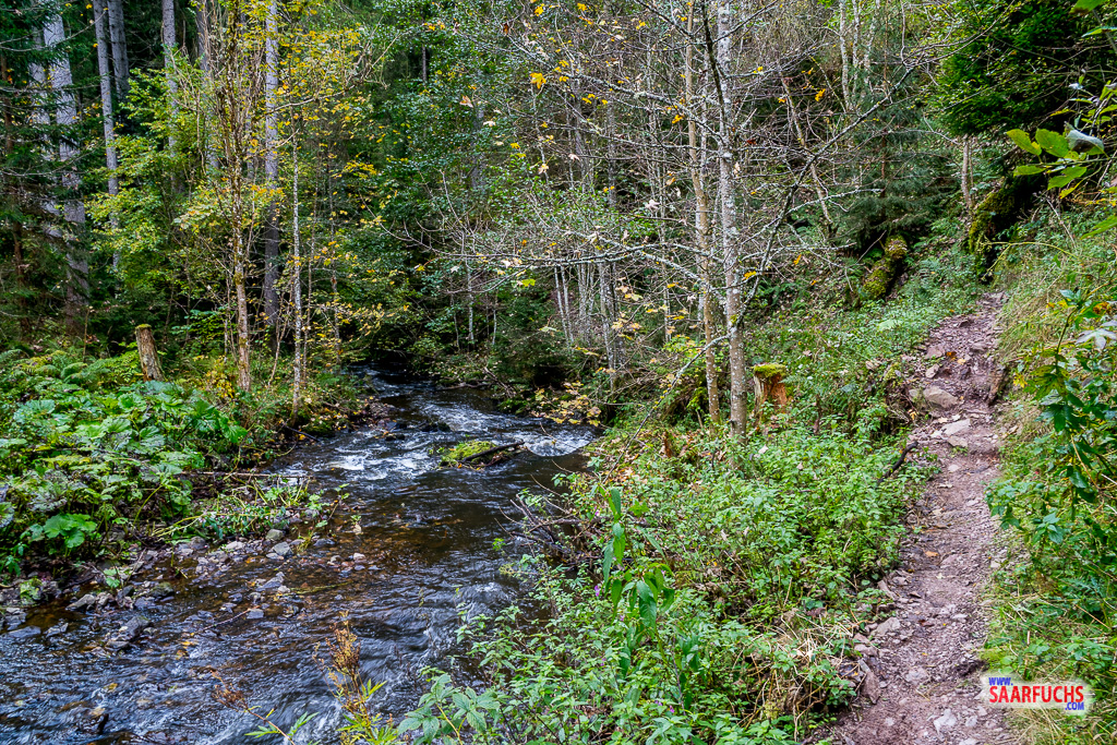 Kurz hinter dem markanten umgestürzten Baum erreiche ich die Stelle, an der der Rötenbach schließlich in die Wutach mündet. Die Brücke dort lasse ich allerdings wieder links liegen, denn nun wartet ein längerer Anstieg auf mich.