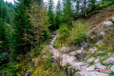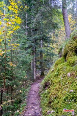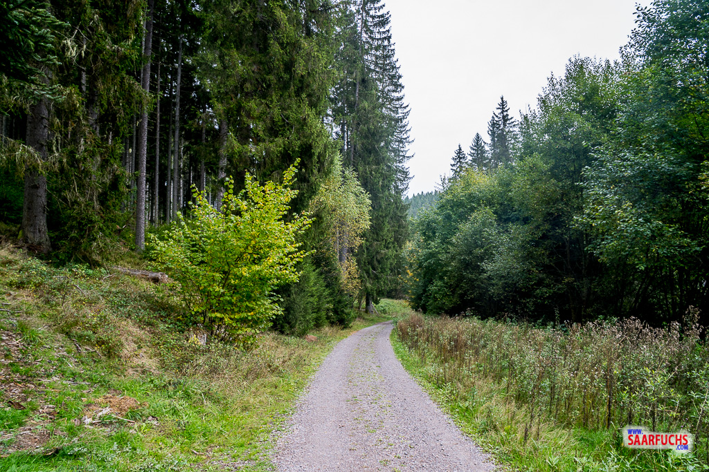 Nachdem ich mein Auto abgestellt habe, starte ich meine Tour vom Parkplatz aus zunächst über einen asphaltierten Weg, der mich direkt in den schönen Nadelwald führt.