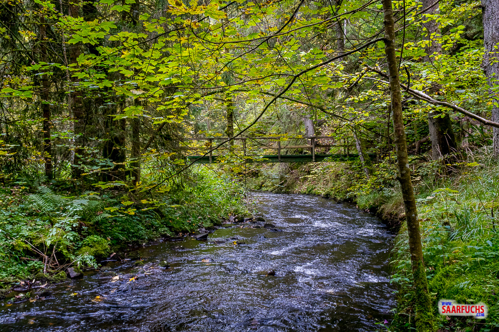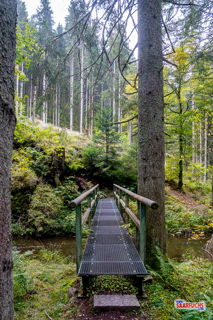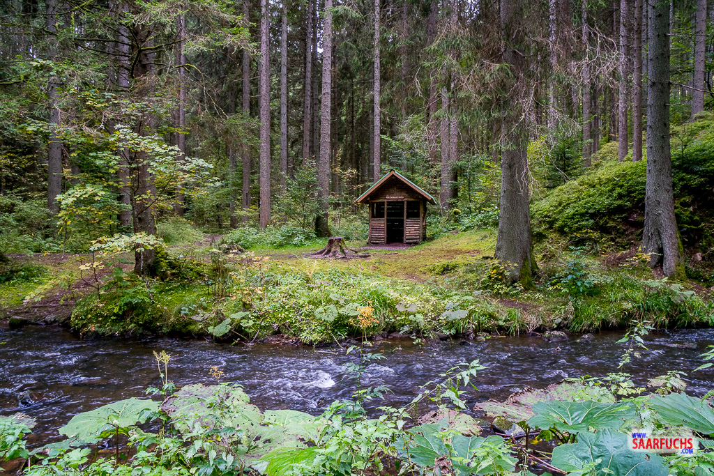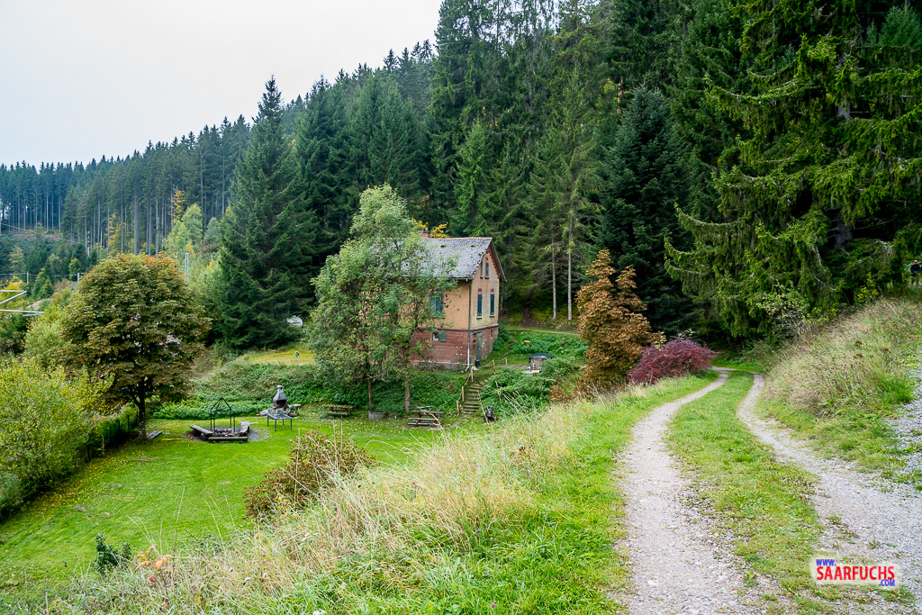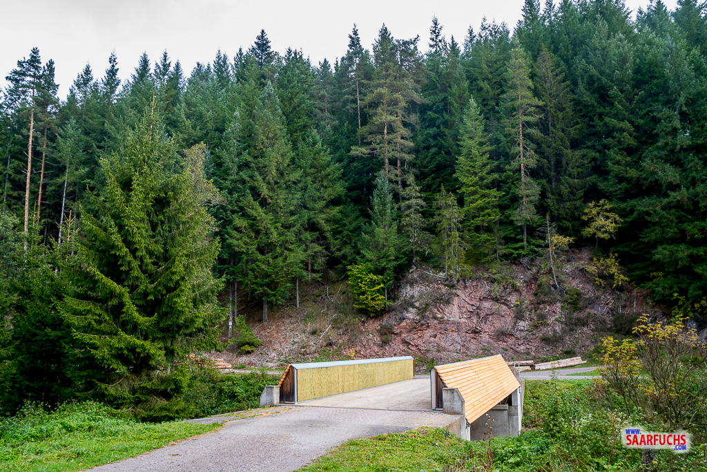 Das Haus liegt heute ganz verlassen und still da, was der Atmosphäre am Waldrand etwas Friedliches verleiht. Da ich nach dem anstrengenden Aufstieg ohnehin eine Stärkung brauche, nutze ich die Gunst der Stunde und lege am Tisch im Garten meine Mittagspause ein. Ich packe meine belegten Brote und die Wasserflasche aus und genieße die Ruhe im Schwarzwald. Nach einer knappen halben Stunde Pause fühle ich mich wieder fit und wandere weiter. Der Weg führt mich über einen breiten Fahrweg gemütlich dahin, bis ich schließlich wieder die Brücke erreiche.