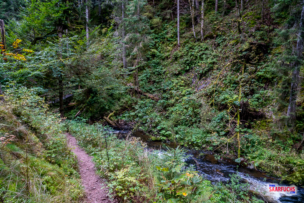 Unten wieder am Röthenbach angekommen, überquere ich die Brücke und folge dem Fahrweg nach links. Lange bleibe ich dort jedoch nicht, denn schon am nächsten Wegweiser biege ich rechts in einen schmalen Pfad ein. Dieser Abschnitt führt mich durch einen herrlich idyllischen Nadelwald, wo es am Bach entlang leicht bergauf geht.
