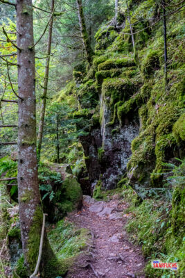 Die gesamte Umgebung wirkt durch die mit Moos bewachsenen Felsen unglaublich idyllisch.
