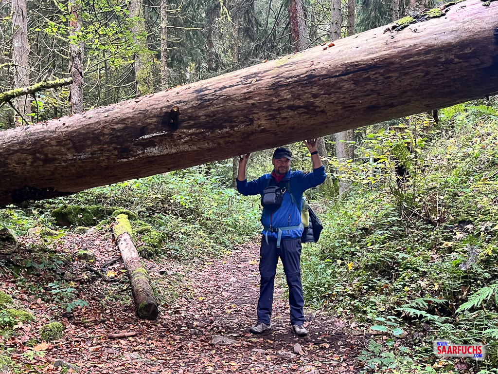 Hier kommt es definitiv auf die richtige Perspektive an: Ich habe die Gelegenheit direkt für ein lustiges Selfie genutzt. Mit dem richtigen Winkel sieht es so aus, als würde ich den massiven Stamm wie Herkules nach oben stemmen – ein tolles Motiv für jeden Wanderbericht.