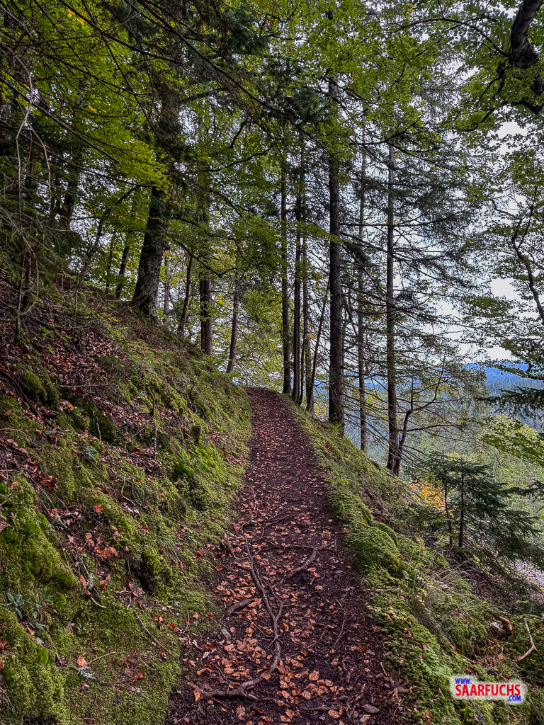 Ich setze meine Tour anschließend über einen schmalen Wanderpfad fort, der sich abwechslungsreich durch das Gelände schlängelt. Der Weg steigt mal zum Teil kurz und knackig an und fällt dann wieder ab. Hier solltest du allerdings ein bisschen aufpassen: Der Boden ist an vielen Stellen mit Wurzeln durchzogen.