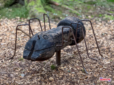 Nachdem ich eine kleine Brücke überquert habe, verlasse ich den dichten Wald für einen Moment. Der Weg führt mich am Waldrand entlang, vorbei an weiten Feldern und Wiesen, bevor es wieder zurück in den Schatten der Bäume geht. Ein besonderes Highlight auf diesem Teilstück sind die vielen liebevoll gestalteten Holzskulpturen von Ameisen, die den Wegesrand säumen.
