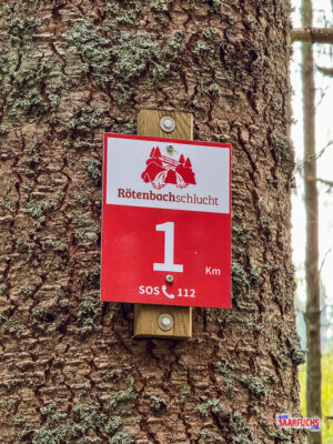 Ab hier wird es richtig idyllisch, denn der Pfad folgt nun direkt dem Lauf des Rötenbachs. Das sanfte Plätschern des Wassers ist für mich der perfekte Begleiter auf diesem ersten Stück meiner Wanderung durch die Schlucht. Wenn du genau hinschaust, entdeckst du am Wegesrand vielleicht auch die ersten Biberspuren.