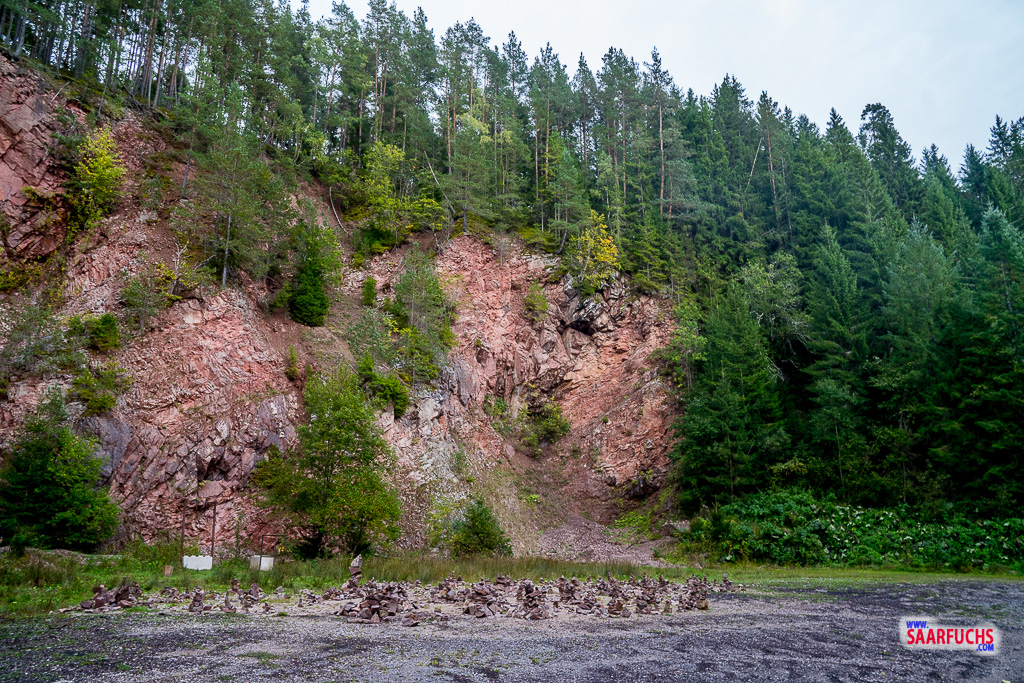 Achte hier auf die Wegweiser: Kurz darauf zweigt die Route rechts den Hang hinunter ab. Ich folge dort einem breiten Forstweg, der mich an einer beeindruckenden Felswand vorbeiführt. Ein besonderer Blickfang ist der Platz direkt davor, an dem mich unzählige Steinmännchen begrüßen – ein tolles Motiv für ein kurzes Foto, bevor es weitergeht.