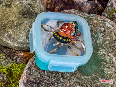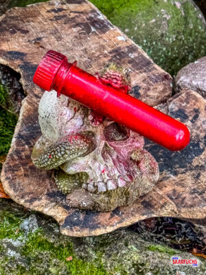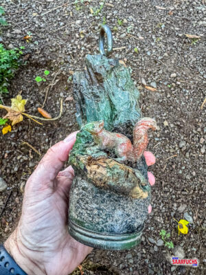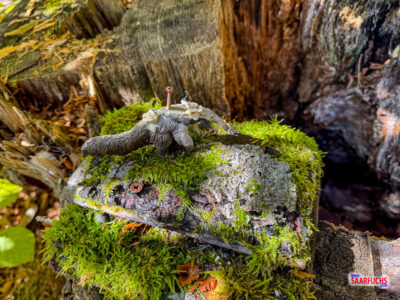 Zwischen den Steinen werde ich schließlich fündig und bin absolut begeistert von der handwerklichen Qualität, denn der Kopf eines Skelettes mit einer Schlange dient hier als kreative Halterung für den Petling.