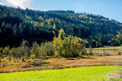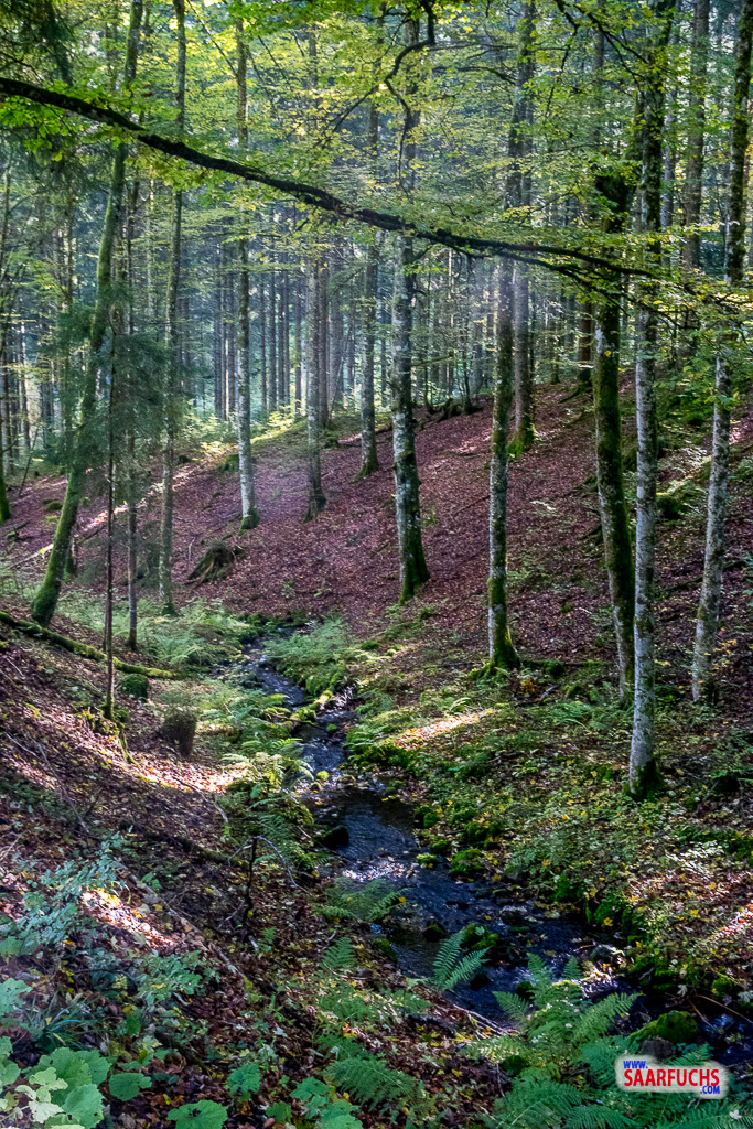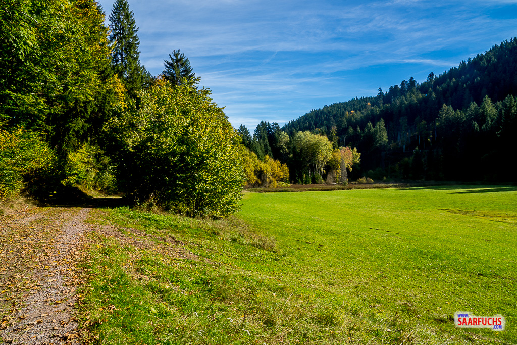 Nach dem Fund folge ich dem Forstweg und biege rechts in einen breiten Weg ein, während zu meiner Rechten der Urseebach plätschert, der sich hier als kleiner Bergbach ein charmantes V-Tal in die Landschaft gegraben hat.