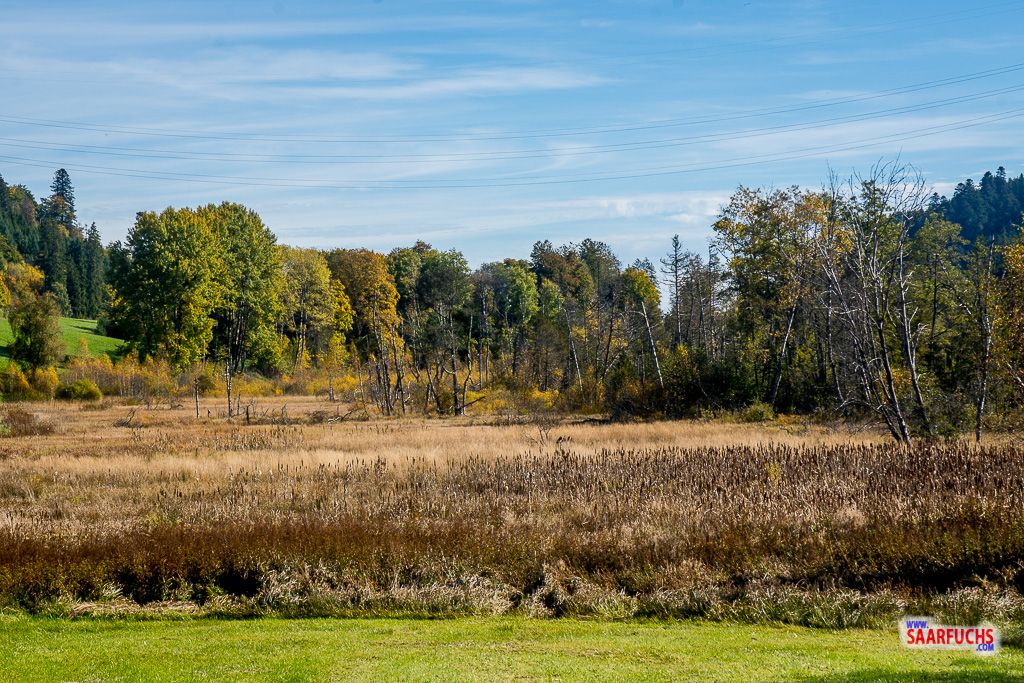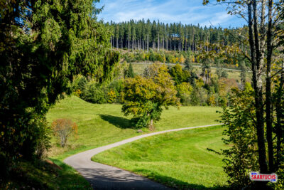 Noch etwas weiter trennen sich die beiden Wege wieder und ich folge nun dem asphaltierten Fahrweg durch eine offene und sehr sonnige Wiesenlandschaft, …