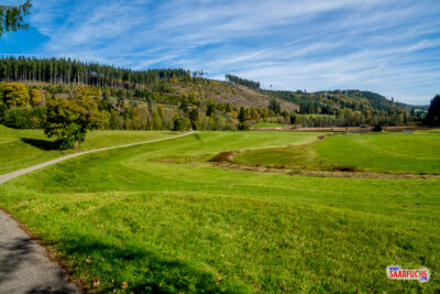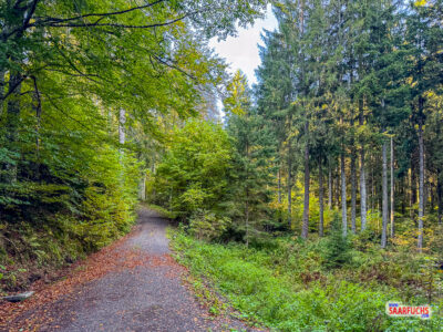 Die gesamte Laufstrecke beträgt angenehme 6,4 Kilometer, auf denen ich lediglich 60 Höhenmeter überwinden muss. Das macht die Tour sehr kurzweilig. Ich wandere dabei über breite Forstwege, entdecke zwischendurch ein paar schmale Pfade und nutze auch kurze Abschnitte auf asphaltierten Fahrwegen. Dabei genieße ich die Ruhe der Natur.