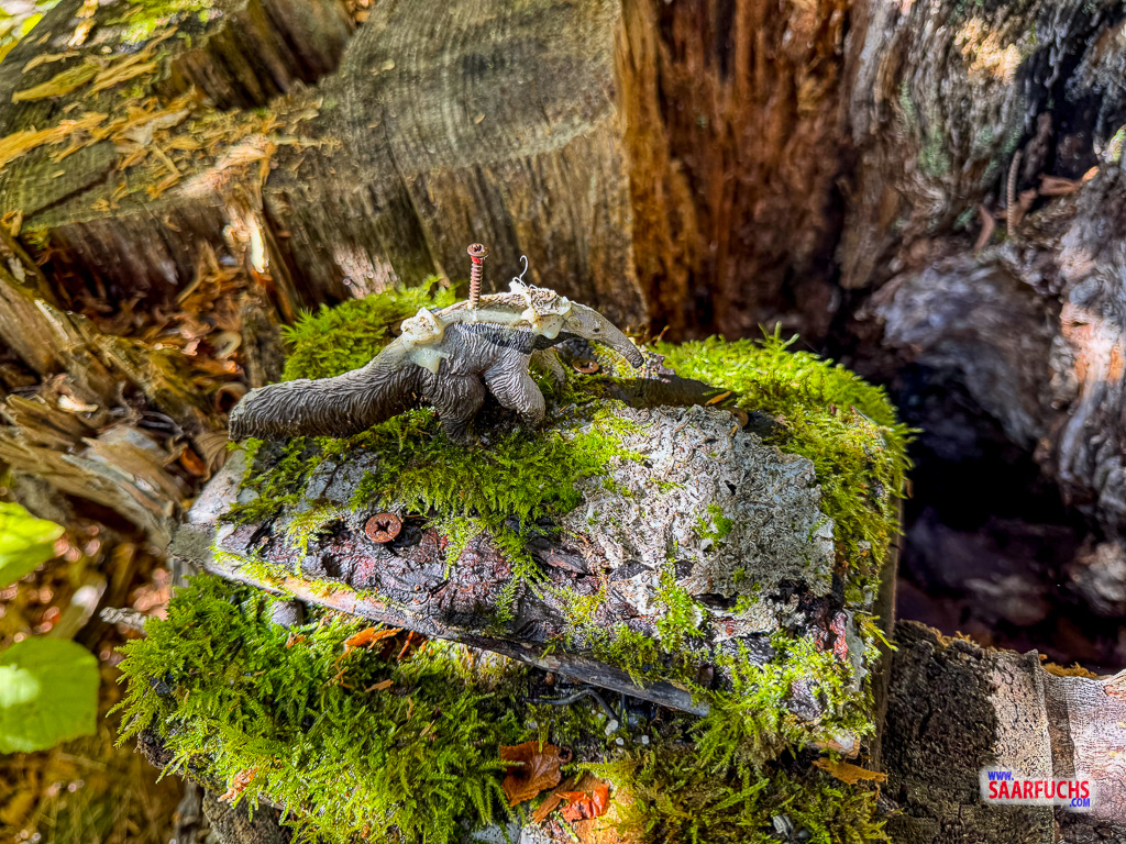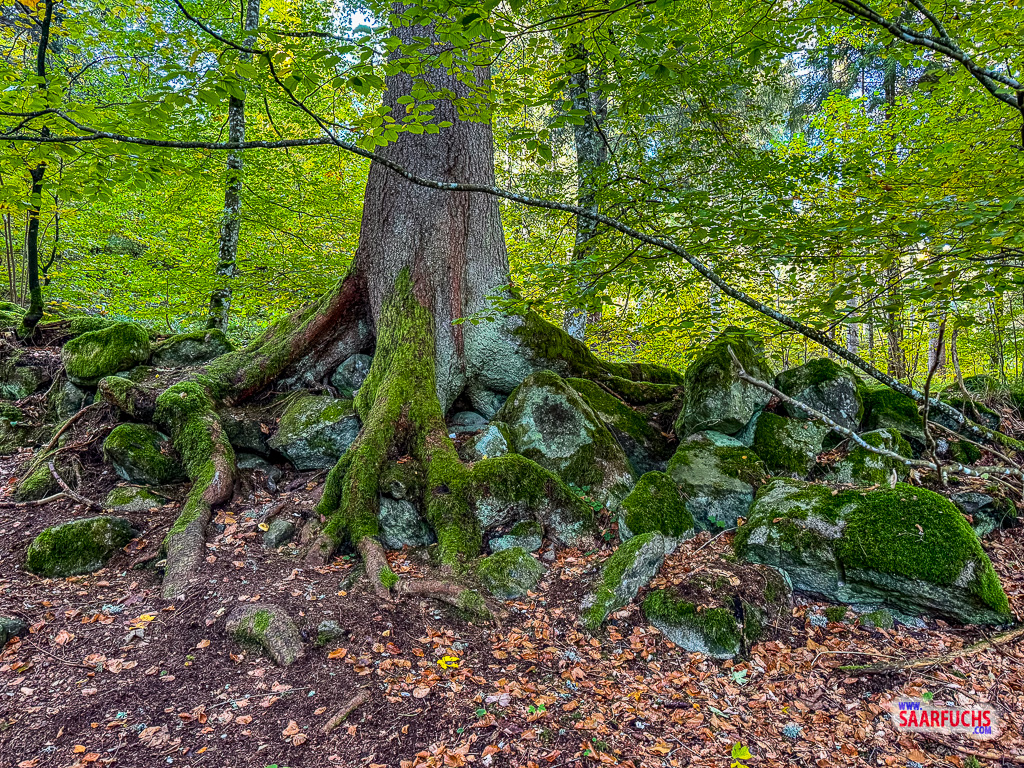 Nach einiger Zeit komme ich an einer riesigen, bemoosten Wurzel vorbei, die fast schon mystisch wirkt, und suche ganz in der Nähe den nächsten Geocache dieser Serie.